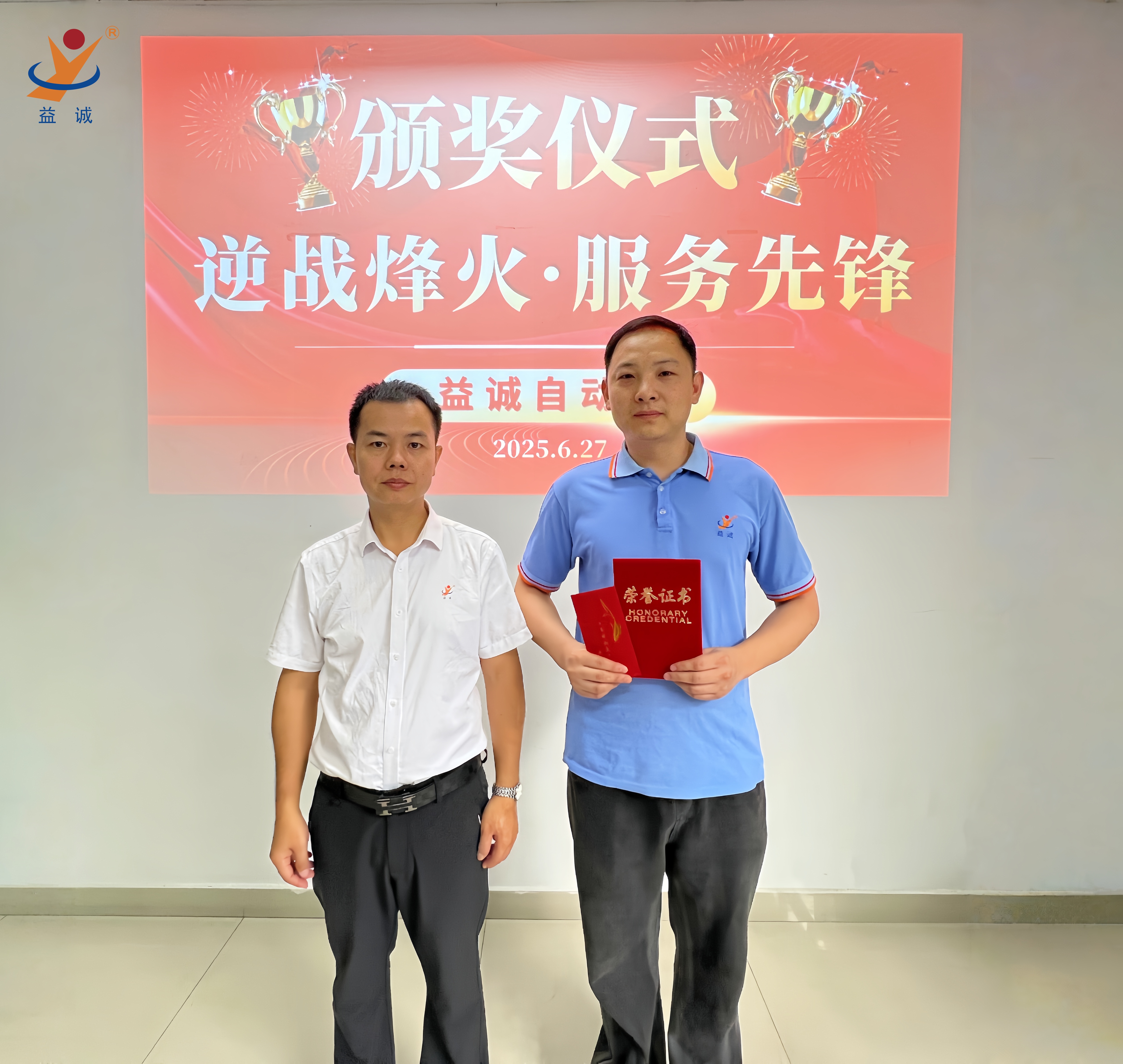 为表彰孙艺浩、陈林春在本次售后任务中作出的卓越贡献,公司在俩人回国后特举办了表彰大会,潘总经理亲自为他们 颁发了“逆战烽火·服务先锋”的荣誉证书。