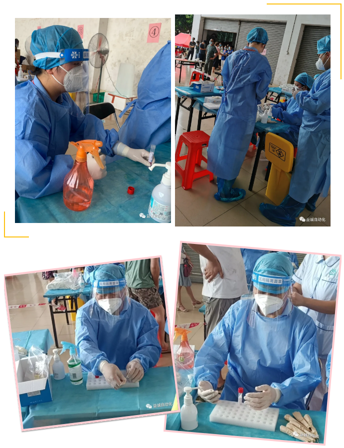 当日,东莞天气骄阳似火、烈日炎炎,室外气温高达三十多度。超凡国际自动化五名志愿员分两批轮班,投身抗疫一线。他们快速学习了工作要求,迅速上岗,承担了医护人员采样辅助、封瓶、包装检测试管等工作。