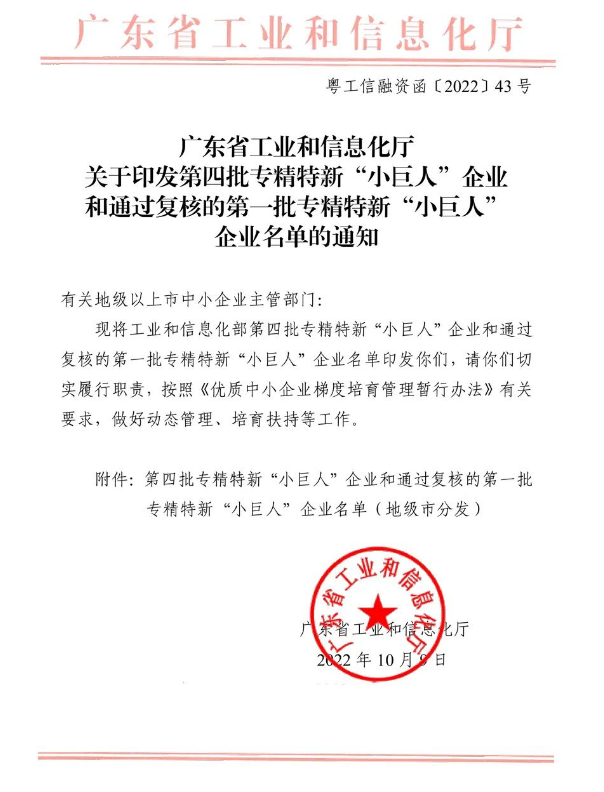 2022年10月9日,广东省工业和信息化厅发布文件,公布了广东省获得国家级第四批专精特新“小巨人”企业的名单。我司凭借领先的技术实力、持续的创新能力、巨大的市场发展潜力,以及在行业内取得的优异成绩,成功获评国家级专精特新“小巨人”企业的荣誉。