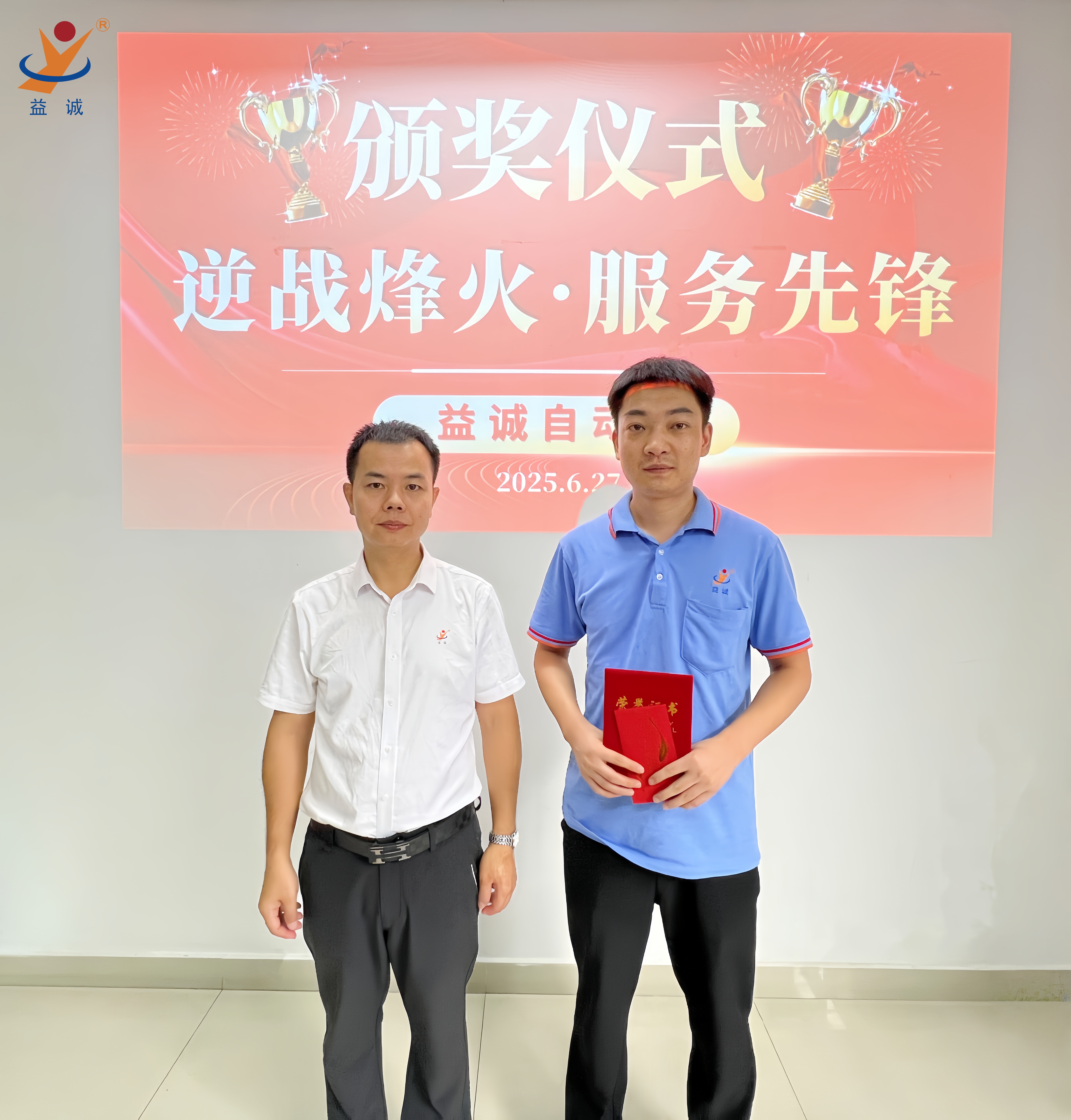 为表彰孙艺浩、陈林春在本次售后任务中作出的卓越贡献,公司在俩人回国后特举办了表彰大会,潘总经理亲自为他们 颁发了“逆战烽火·服务先锋”的荣誉证书。