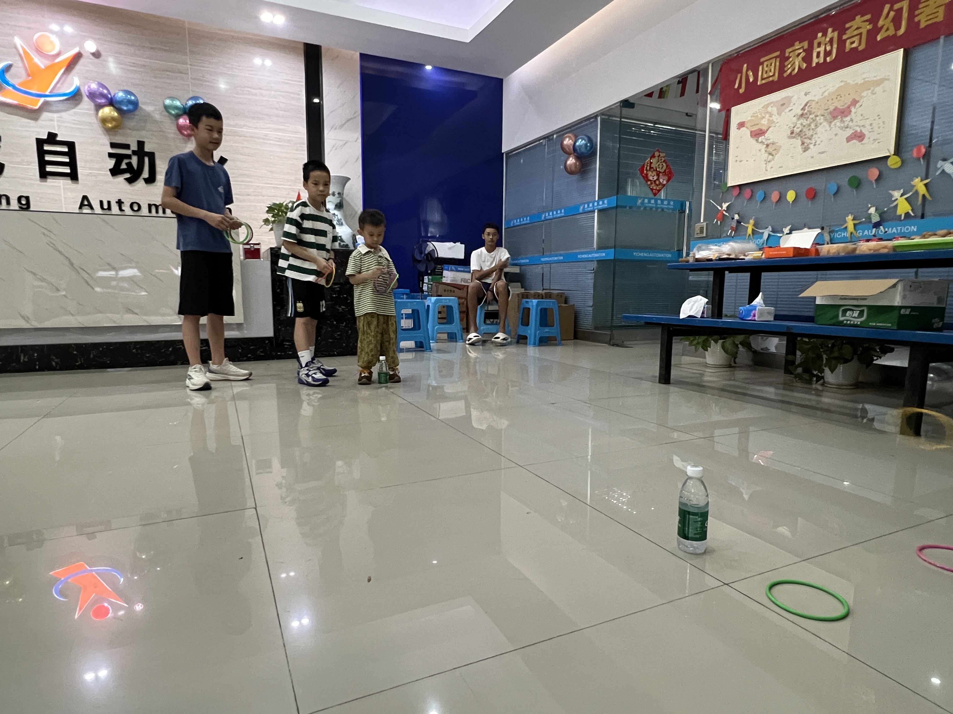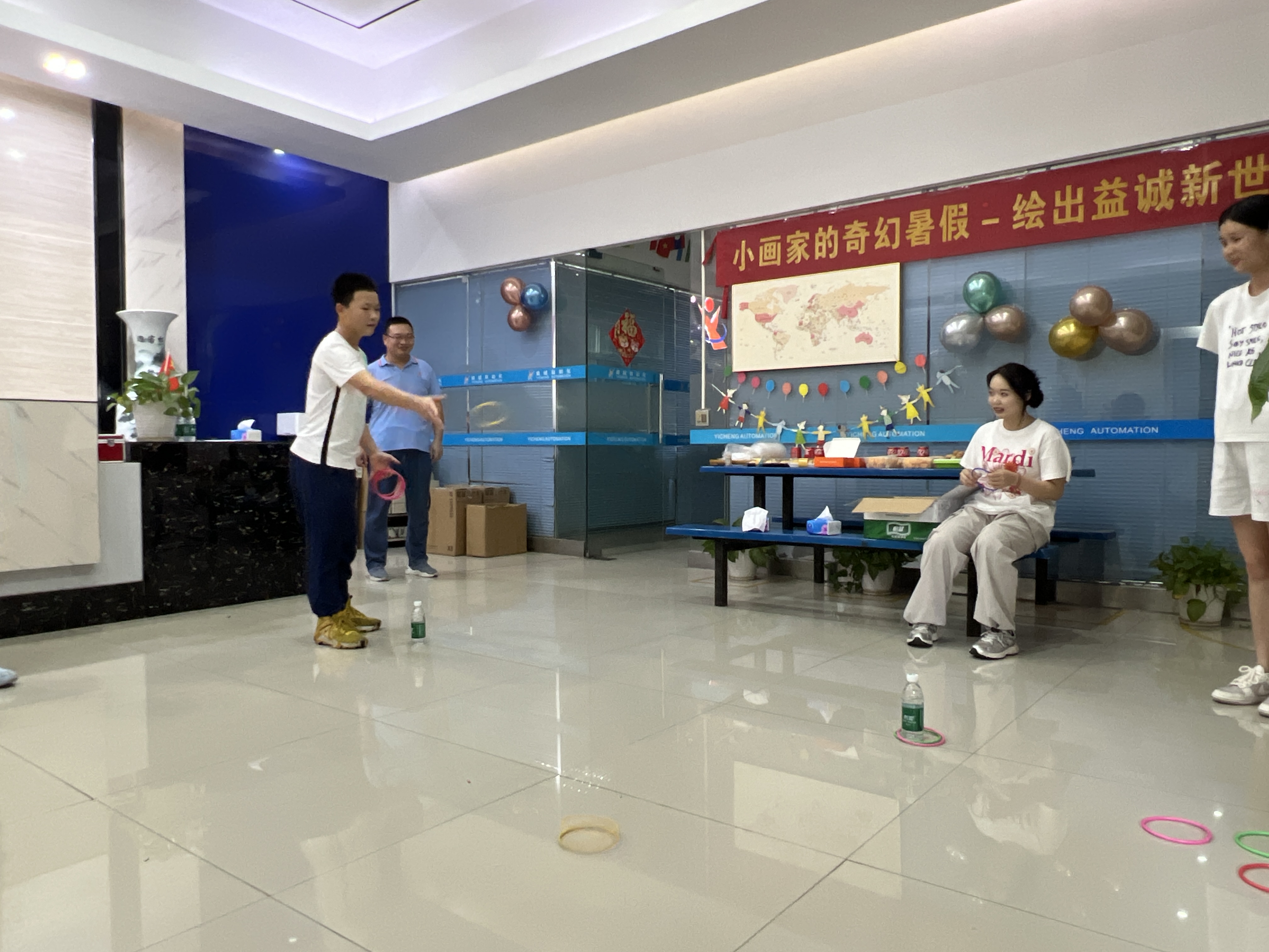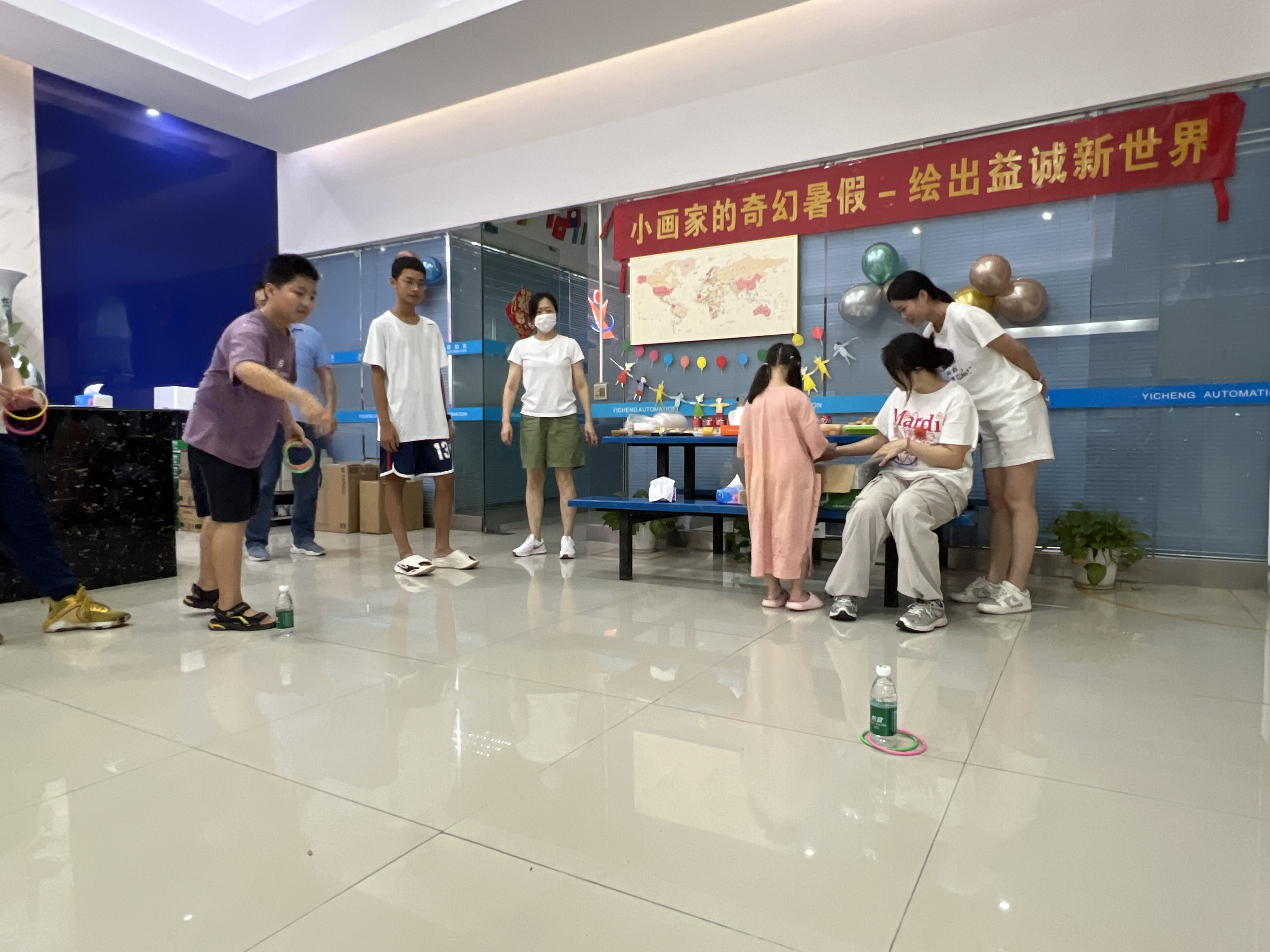 绘画比赛之余,趣味套圈小游戏区域也是热闹非凡。一个个色彩鲜艳的小圈摆放在地上,孩子们排着整齐的队伍,眼睛紧紧盯着目标,跃跃欲试。