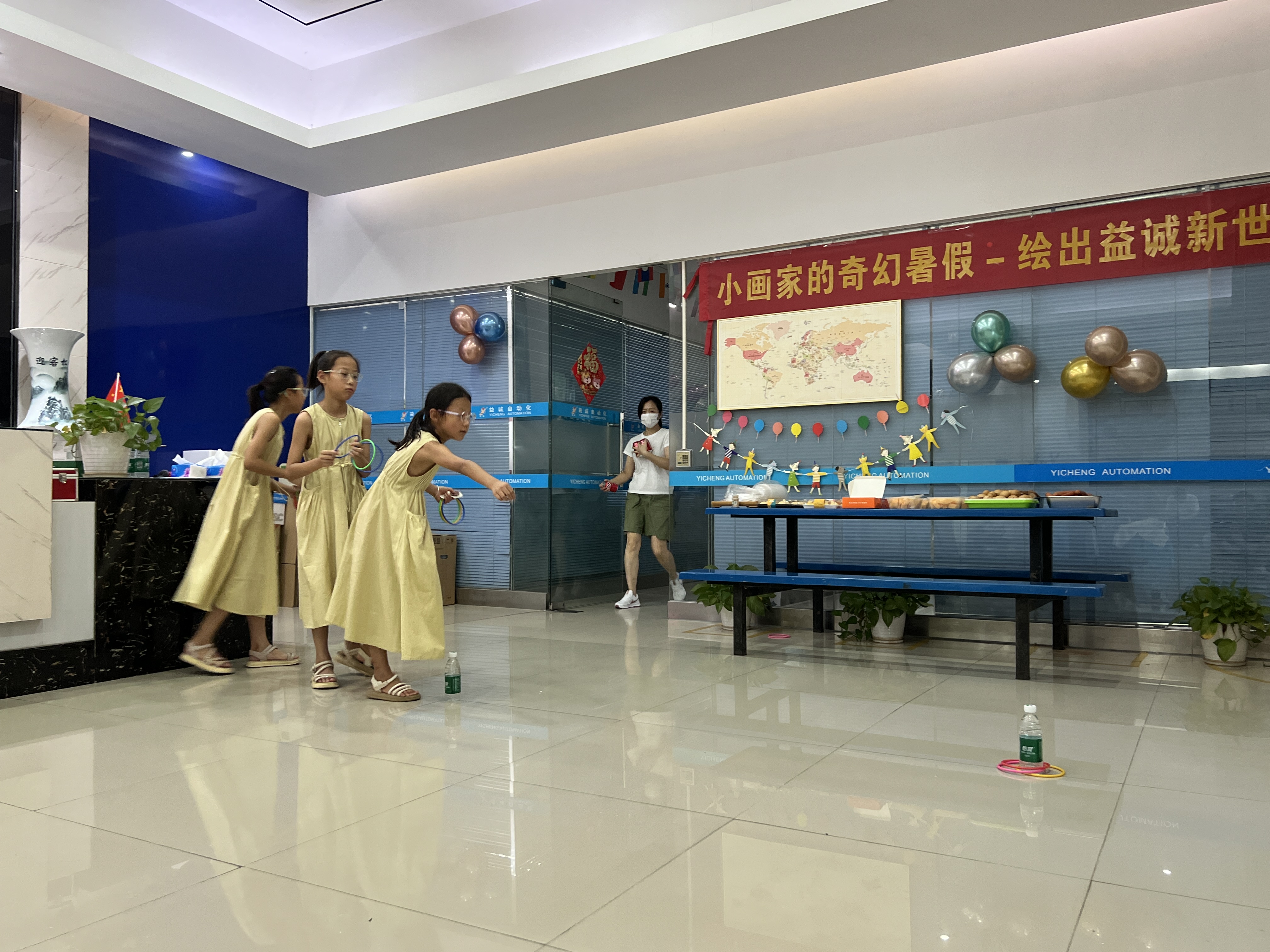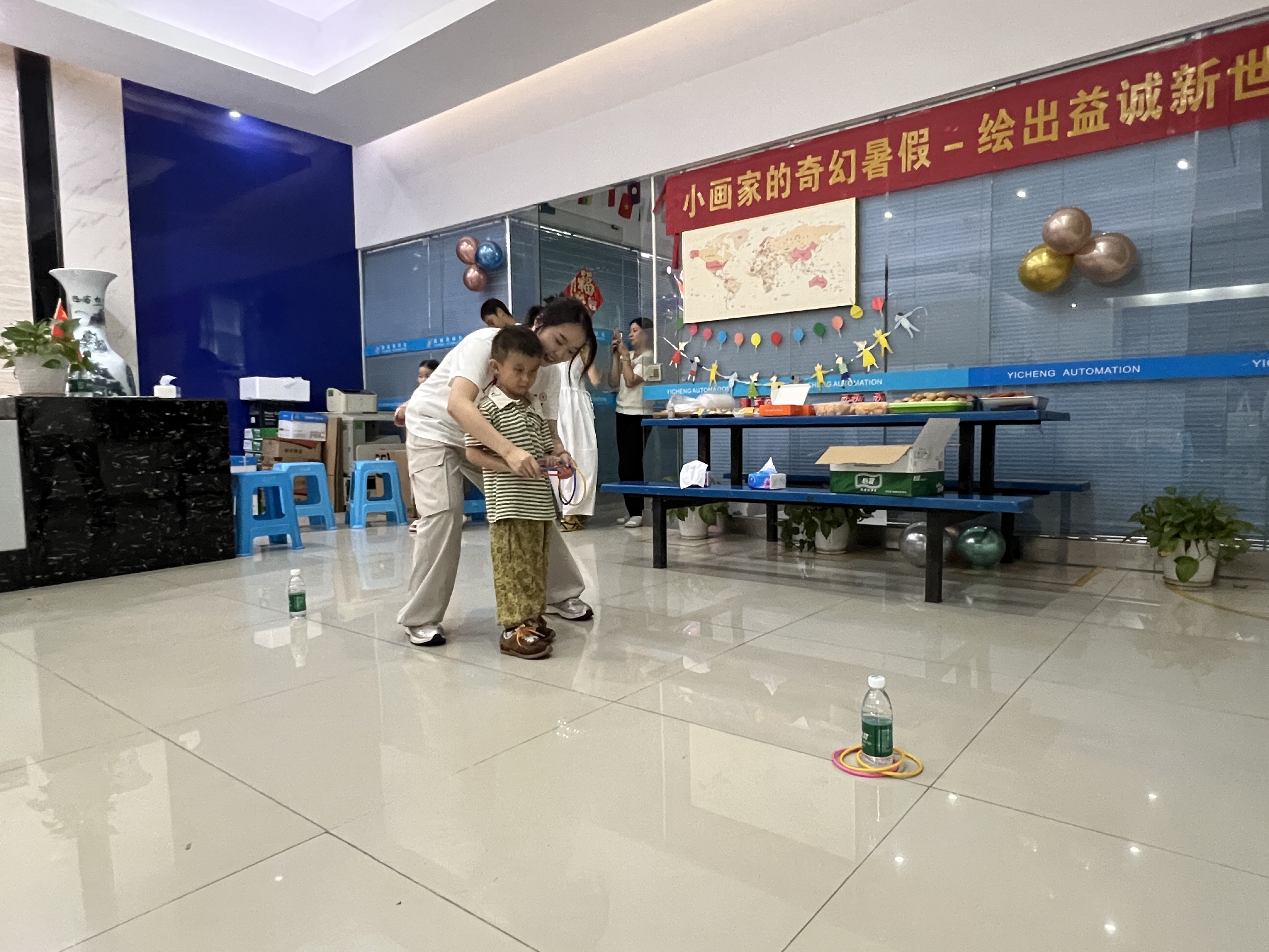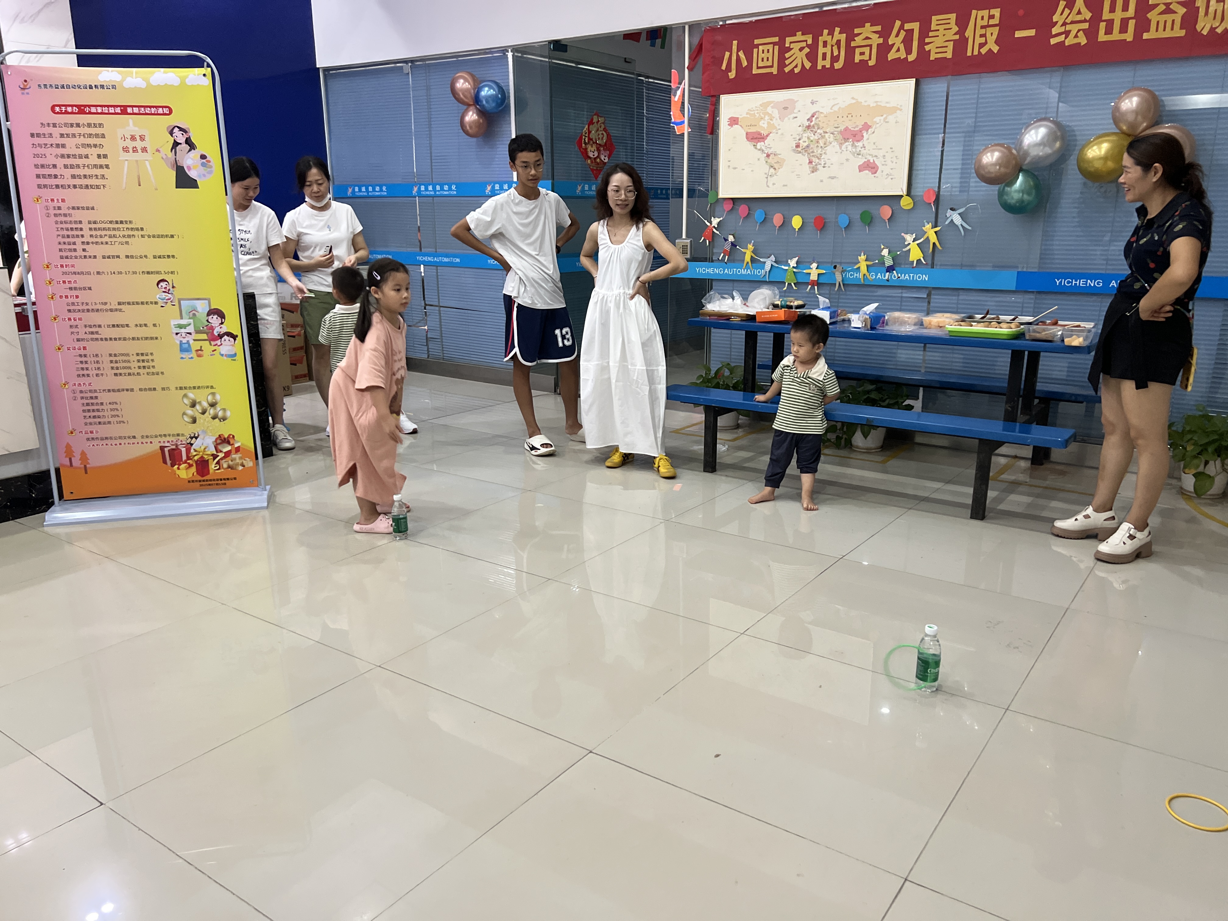 绘画比赛之余,趣味套圈小游戏区域也是热闹非凡。一个个色彩鲜艳的小圈摆放在地上,孩子们排着整齐的队伍,眼睛紧紧盯着目标,跃跃欲试。