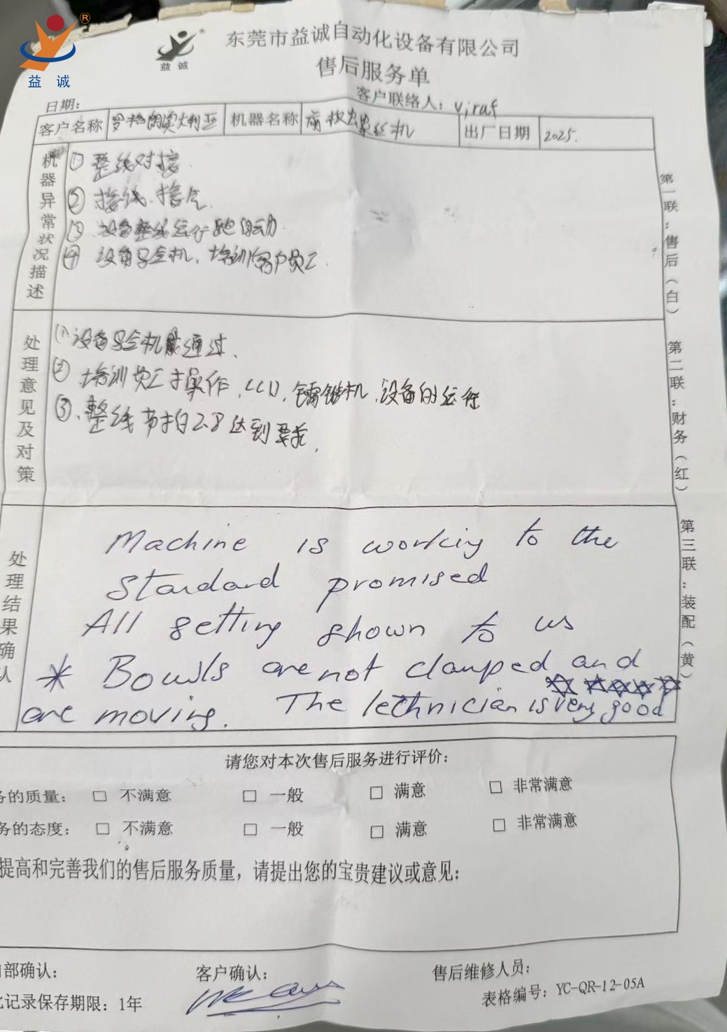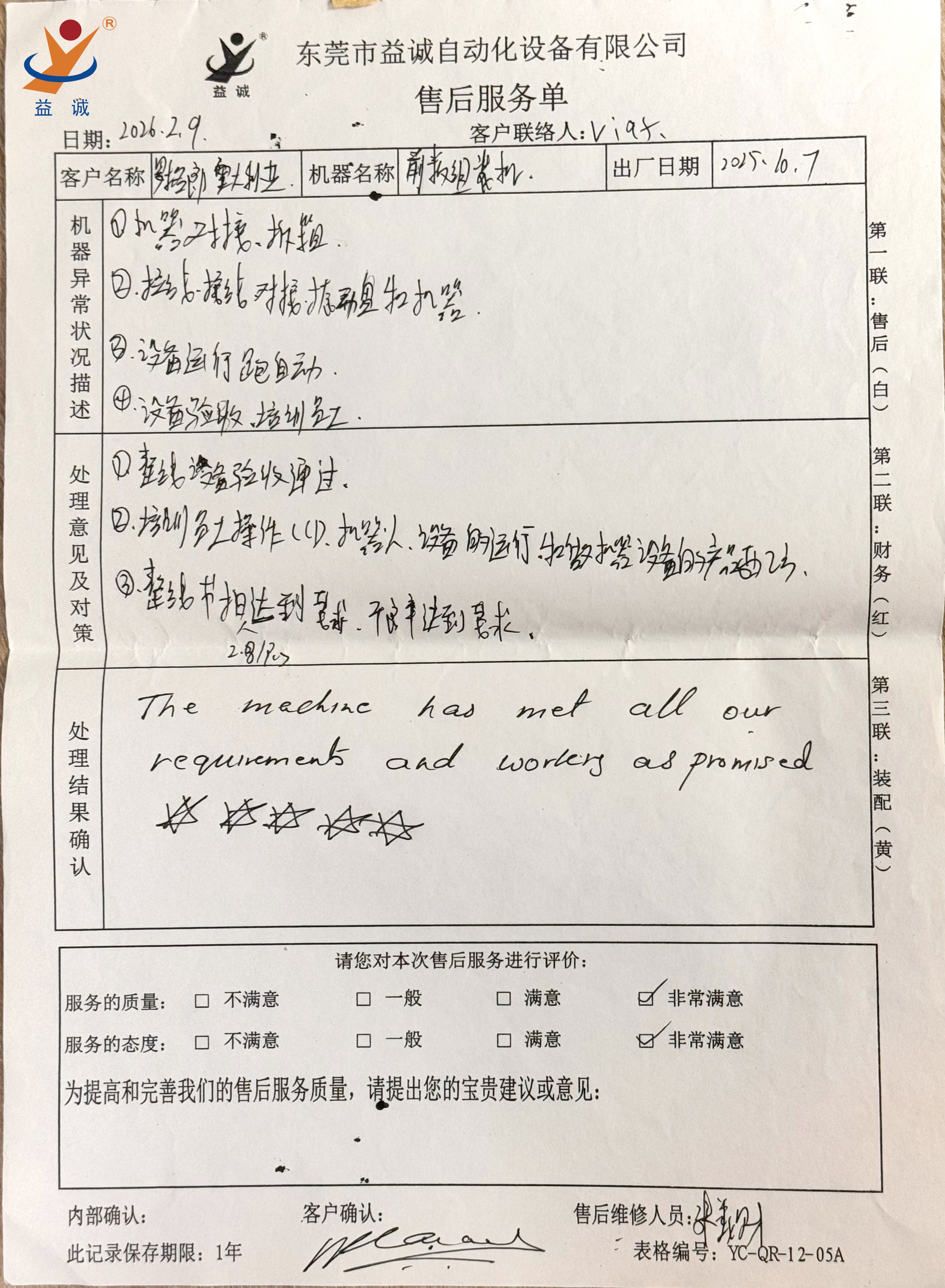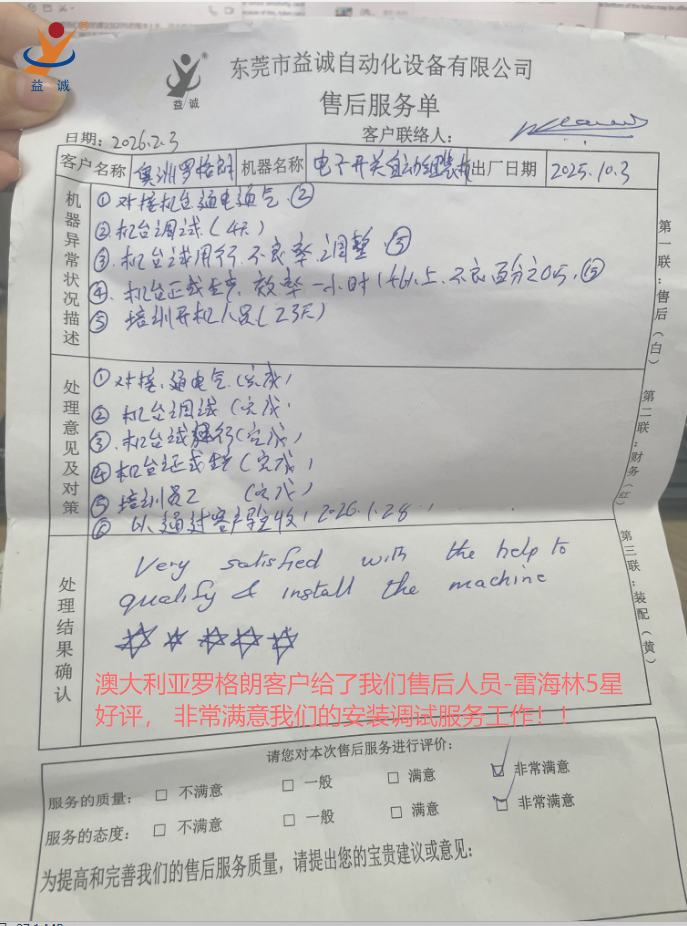 年前,为期一个月的海外项目售后支持任务圆满收官。我司售后服务部刘爱民,自动化事业部六部的雷海林、张義财、何佳豪四位同仁远赴海外。他们凭借精湛的专业技术与真诚卓越的服务态度,在客户全方位的评价体系中,均获得“五星好评”的满分佳绩,赢得客户的高度赞誉与认可。